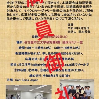医局からのお知らせ 【満員御礼】第14回桜山マイクロサージャリ―講習会 2026/04/17 更新 先日ご案内いたしました第14回桜山マイクロサージャリーは、定員に達しましたので受付を締め切らせていただきます。 ご応募いただきありがとうございました。 一覧に戻る